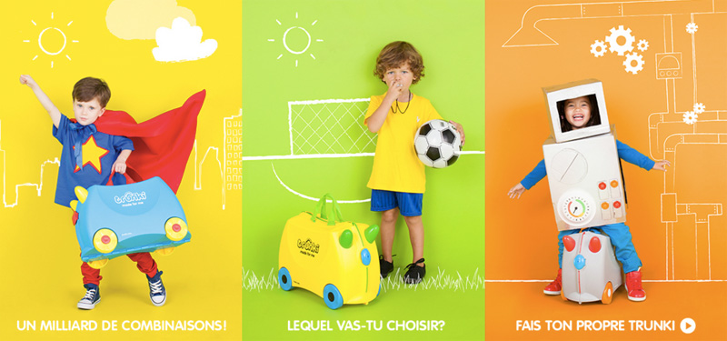 Je connaissais déjà la gamme super rigolote de valises pour enfants de la marque Trunki. Cette marque, super innovante et bien pensée, permet aux enfants de ballader facilement leur propre valise, adaptée à leur taille et surtout de s’amuser à rouler avec une fois installés dessus comme s’il s’agissait d’un porteur. Il est même possible maintenant de customiser sa propre valise Trunki ! (Vendues à 44,99€ la valise avec sangle incluse).
