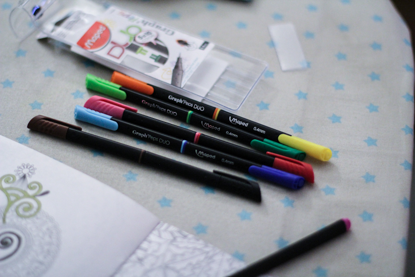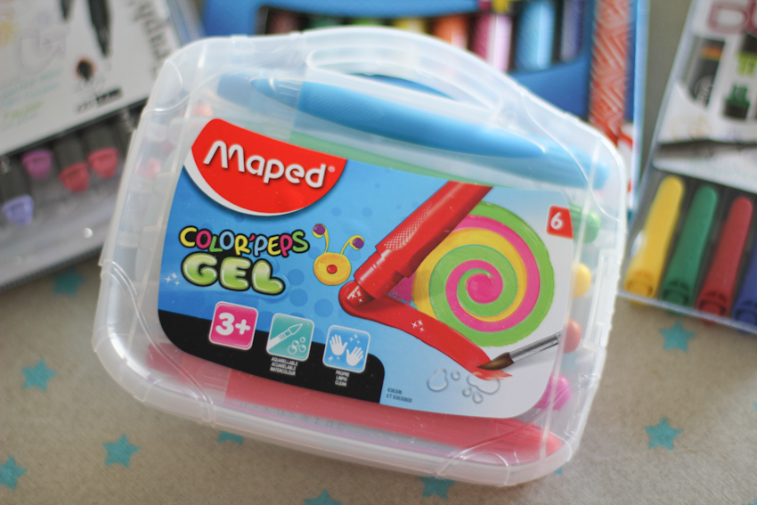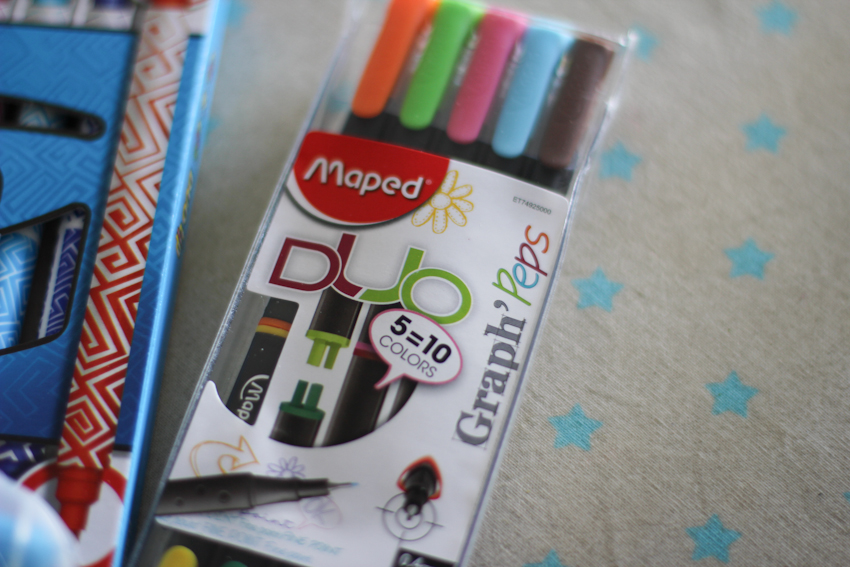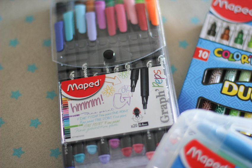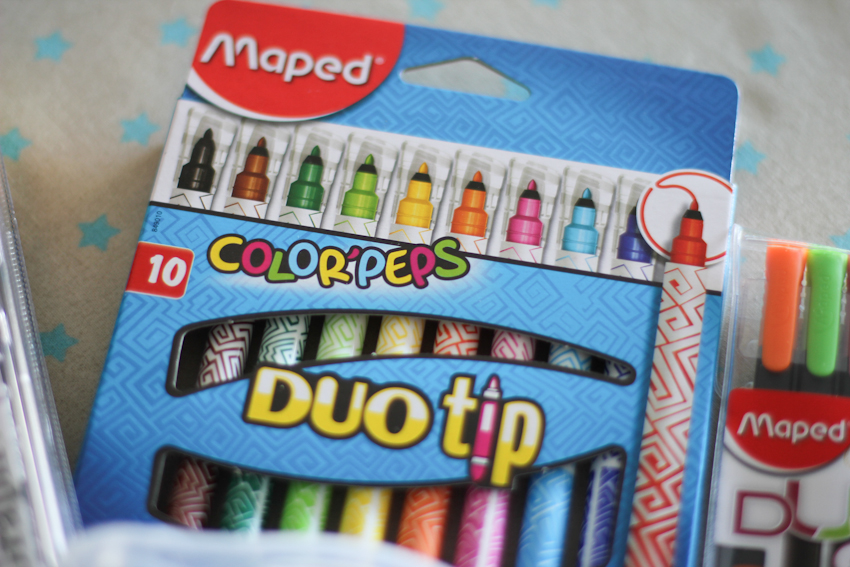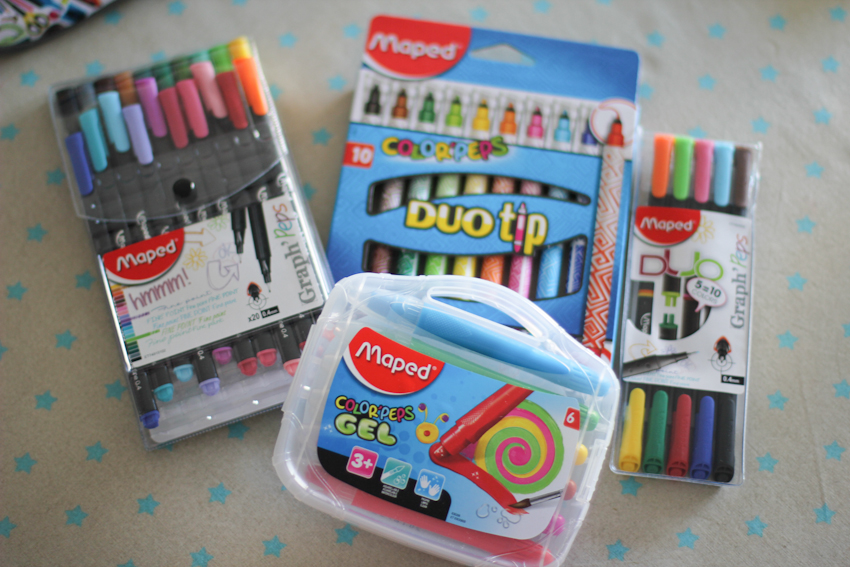 J’ai donc reçu dans une jolie sacoche à l’effigie de Maped une boite de 6 craies de coloriage Color’Peps Gel, une boite de 10 feutres Color’Peps Duo Tip et deux boites de feutres fins Graph’Peps (classiques et duo).