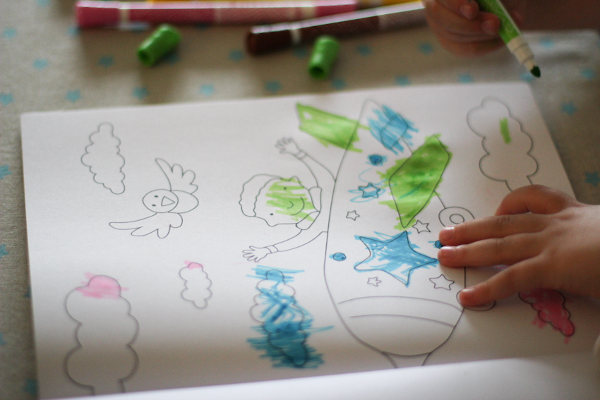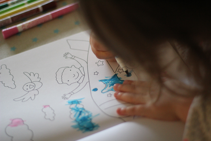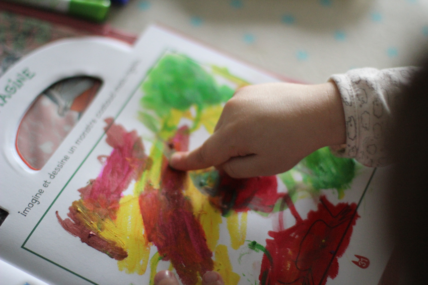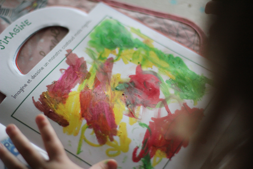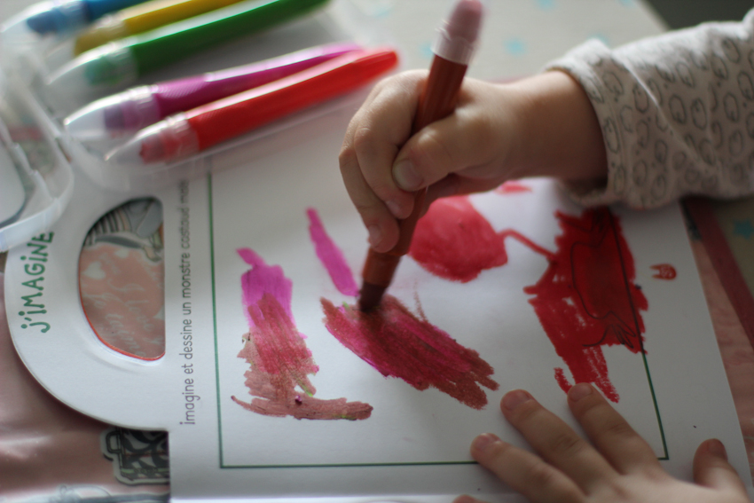 Ma minus adore dessiner, colorier, tamponner… bref faire de jolis « grabouillages » comme elle dit 🙂 J’aime me dire qu’elle tient ça de moi et qu’elle aura hérité de mon tempérament « artiste ». Tout ça me rappelle de jolis souvenirs de l’époque ou j’allais aux Beaux-Arts le mercredi après-midi…