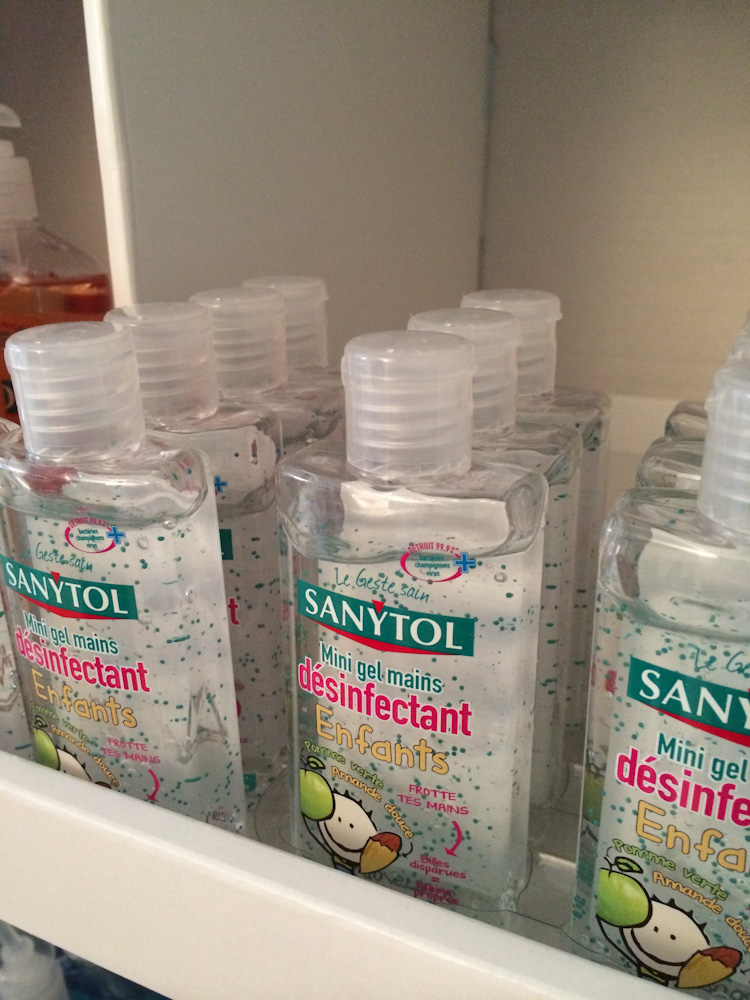 - Le tout nouveau gel hydro-alcoolique Sanytol pour les mains des enfants, avec des micro-billes à éclater, délicatement parfumées à la pomme. L’odeur est présente mais vraiment pas trop forte, et s’évapore au bout d’une minute en même temps que le gel sèche. Etant moi-même une grande accro à ce genre de produit, en particulier à cause de mes déplacements en transports en commun quotidien sur Paris, c’était le must-have qui me manquait dans ma trousse de super-maman.