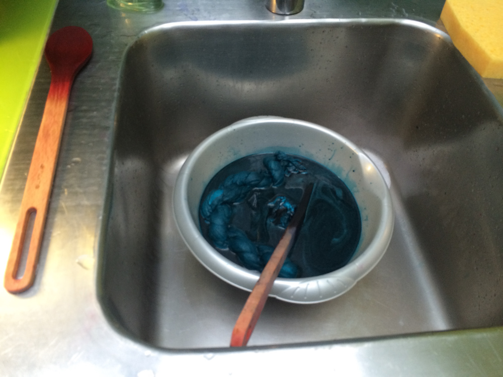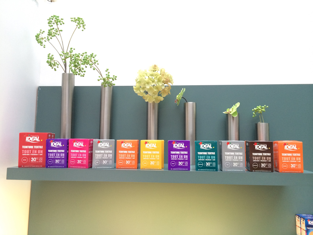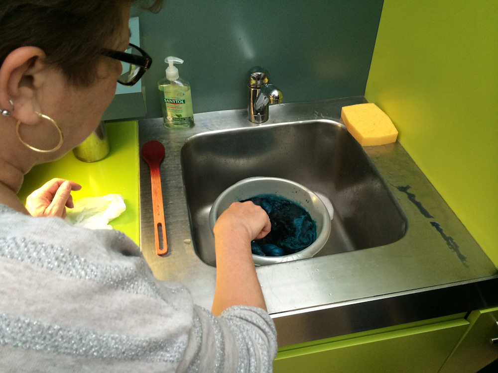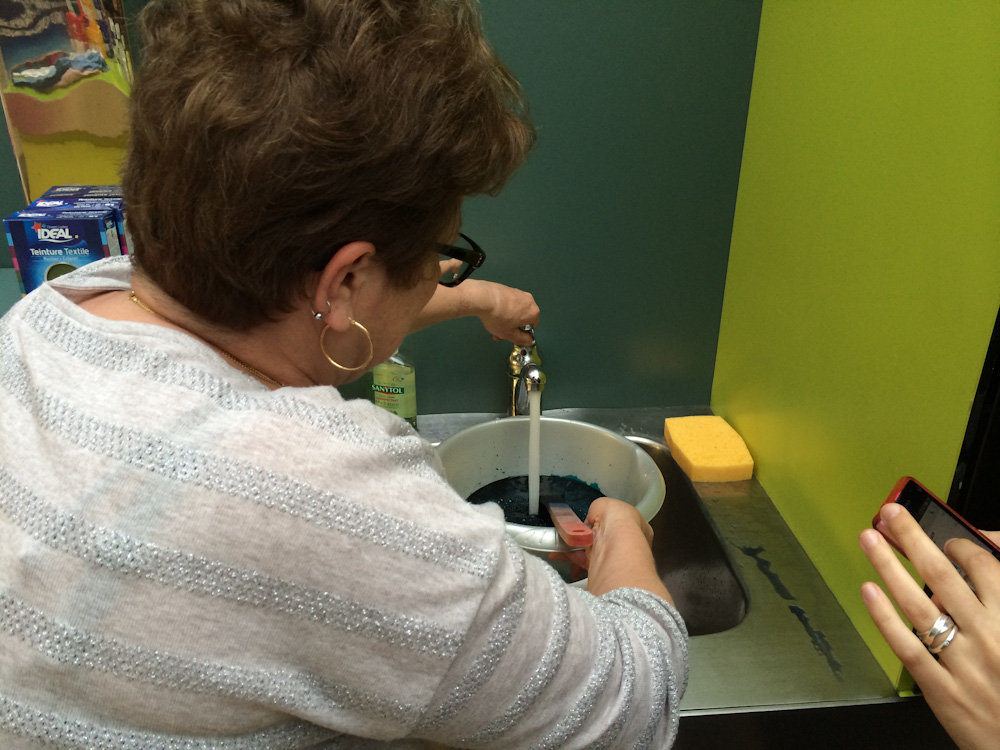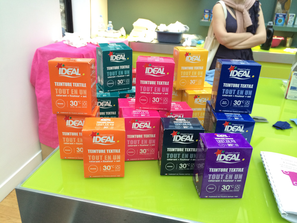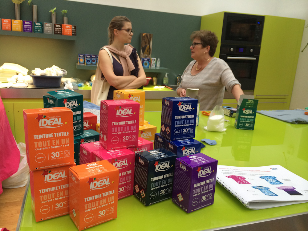 Comme premier atelier nous avons découvert des techniques de teintures avec des produits de la marque Ideal. Vraiment ultra simple à priori, il faut juste du temps et un peu de place pour laisser le produit agir. Soit à froid dans un bain de teinture + sel dans l’évier par exemple ou bien au micro-onde ce qui permet de réduire considérablement les temps de bain du produit de teinture.