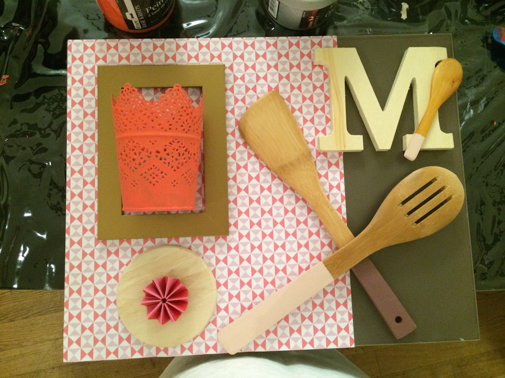 Je me suis lâchée sur le rose fluo sur le cache-pot en métal et la peinture pailletée pour rajouter un fini transparent mais pailleté à la lettre M positionné sur mon moodboard.